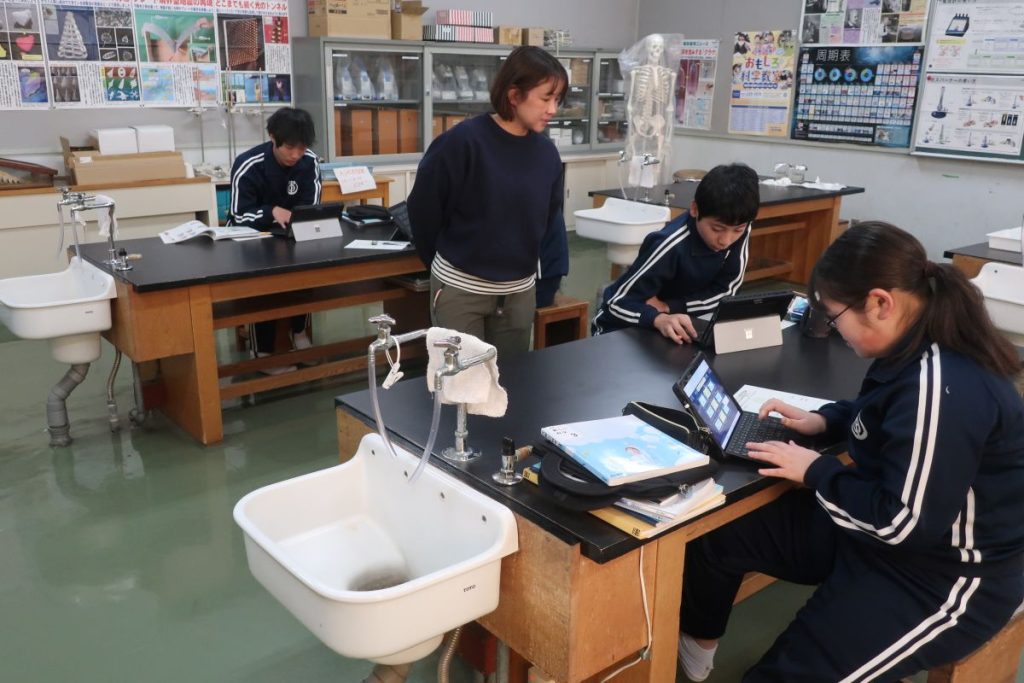 1年生の数学は、ワークを使った問題演習です。質問をしながら一人で解ける問題が増えてきた様子がとてもよくわかりました。1年生、頑張っています!また、理科は、かじかの里学園体験入学者を迎えての授業となりました。楽しく一緒に学習する様子がうかがえました。