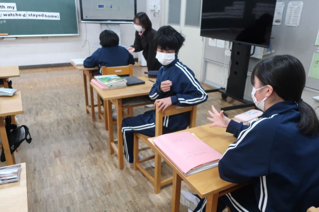 1年生の英語では、冬休みのことを英語で伝える会話に挑戦していました。会話のポイントを教わり、近くの友達とじゃんけんをして役割を決めました。