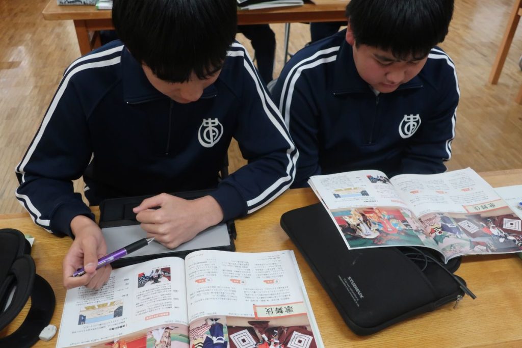 2年生の音楽は、歌舞伎の鑑賞に入りました。今日は歌舞伎についてグループごとに調べました。服装、化粧など、独特なところをロイロノートにまとめていました。みんなで共有して特徴をつかんだところで歌舞伎の鑑賞に入るのでしょう。