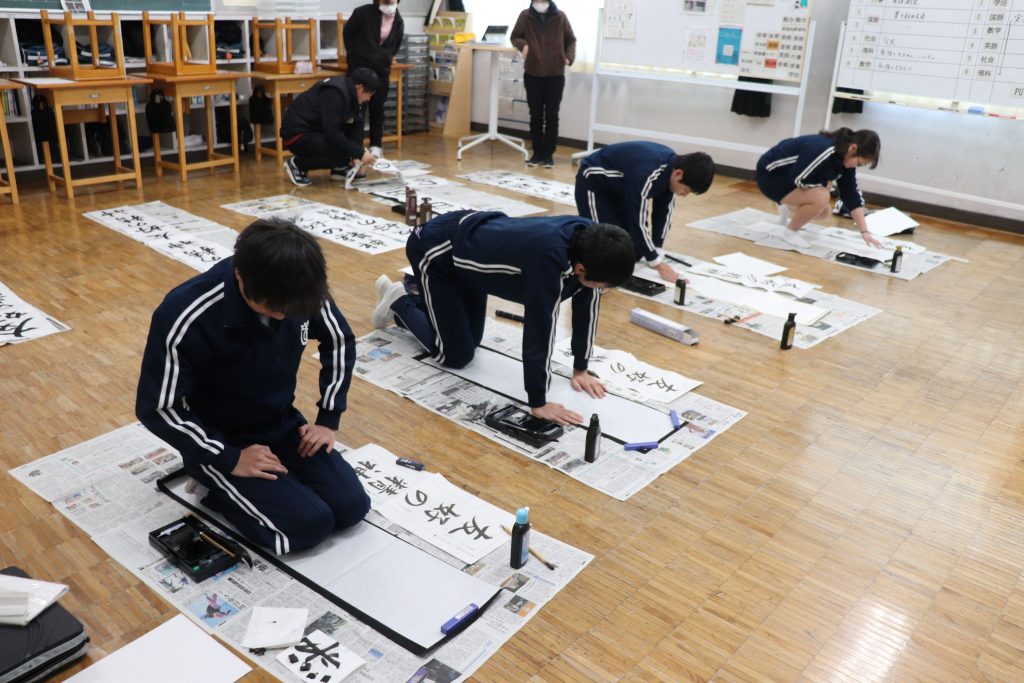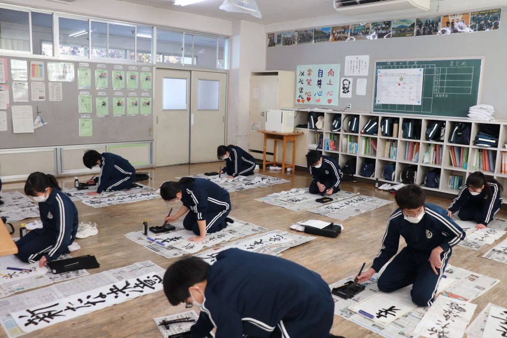 各教室で思いを込めて書きました。素晴らしい字が廊下に掲示されていますので、どうぞ皆さん見に来てください!