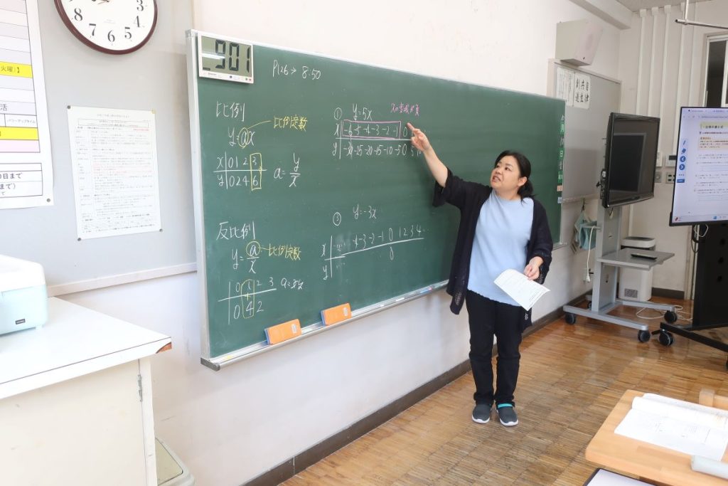 1年生の数学は、比例における変数xが負の場合の学習です。表に整理しながら比例の関係を調べています。