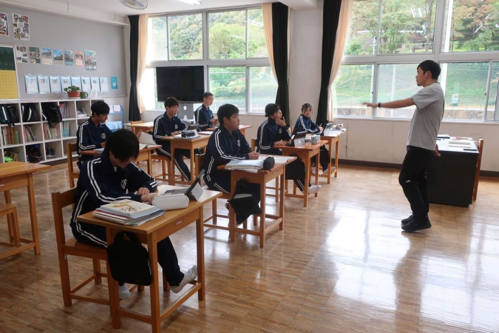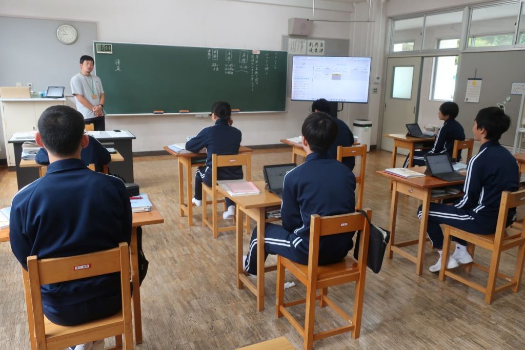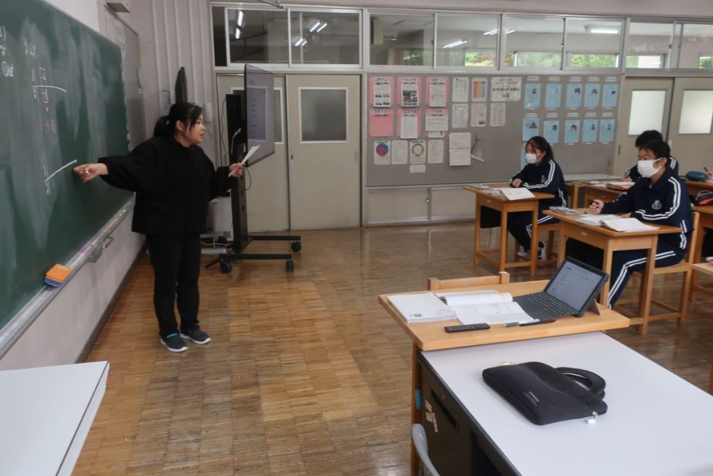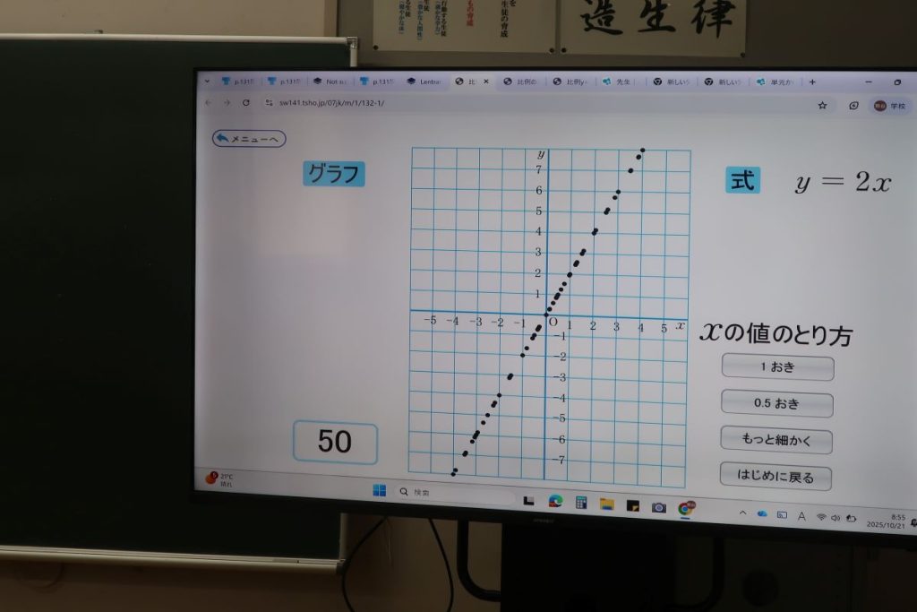 1年生の数学では、関数のグラフのつくり方を学習しました。複数の座標から直線を引くことでなぜグラフが描けるのか。ICTで確認をしながら、みんな納得していました。