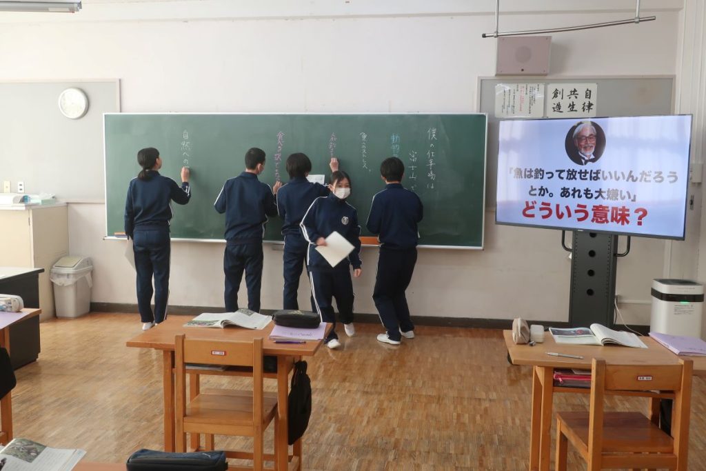 2年生の道徳は、教科書の「私の職場は富士山です」を入り口に、「もののけ姫」を使いながら自然愛護について深く考えました。自然と人間の共生。難しいテーマに対してたくさんの意見が出されていたのが印象的です。