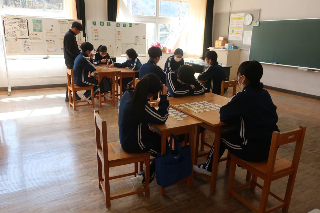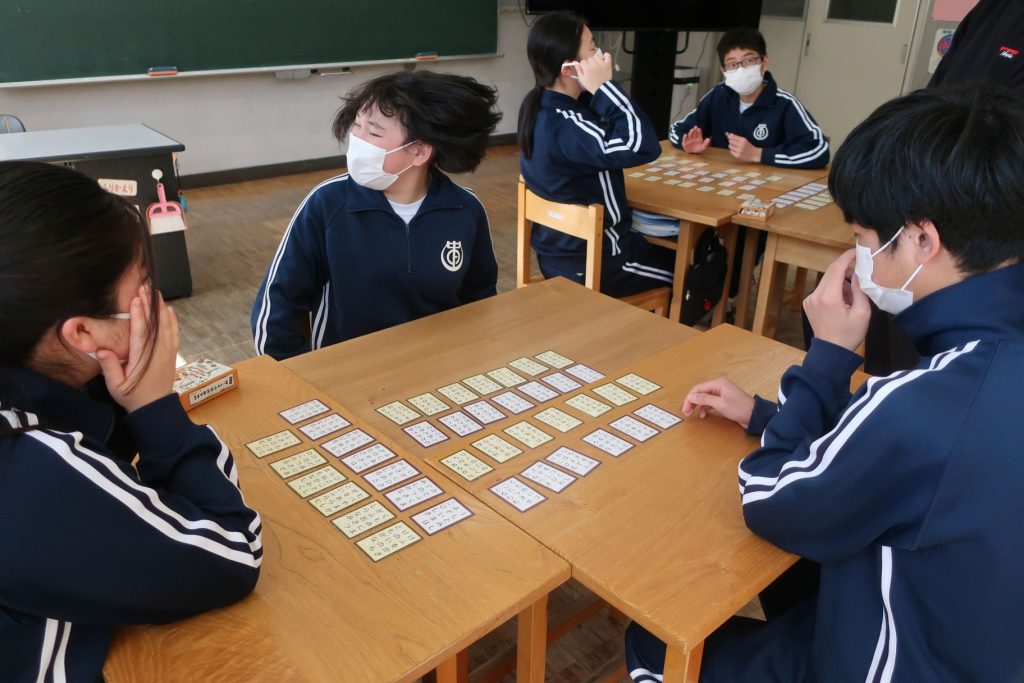 1年生の国語では百人一首をしました。上の句が読まれて下の句をとることができる生徒も既に出てきています。上毛カルタにはみんな慣れていますが、百人一首にも慣れていけるといいですね。