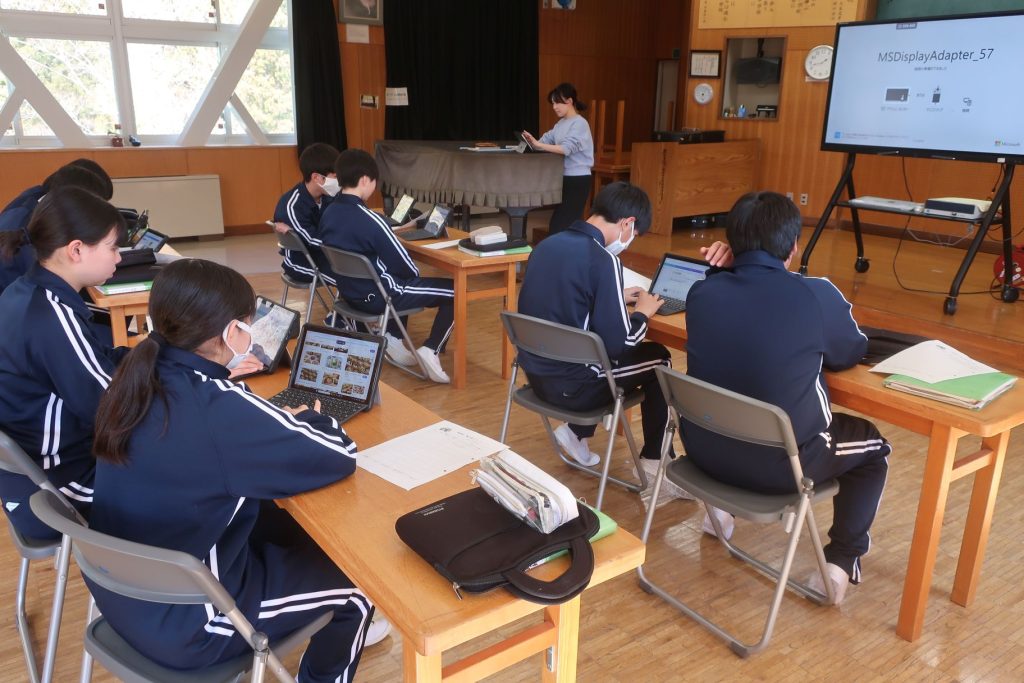 2年生の音楽では、「世界の諸民族の音楽」を調べていました。グループごとに好きな民族音楽を選び、その特徴や楽器などについてまとめていました。なじみのない楽器などに興味を持つ生徒が多かったです。