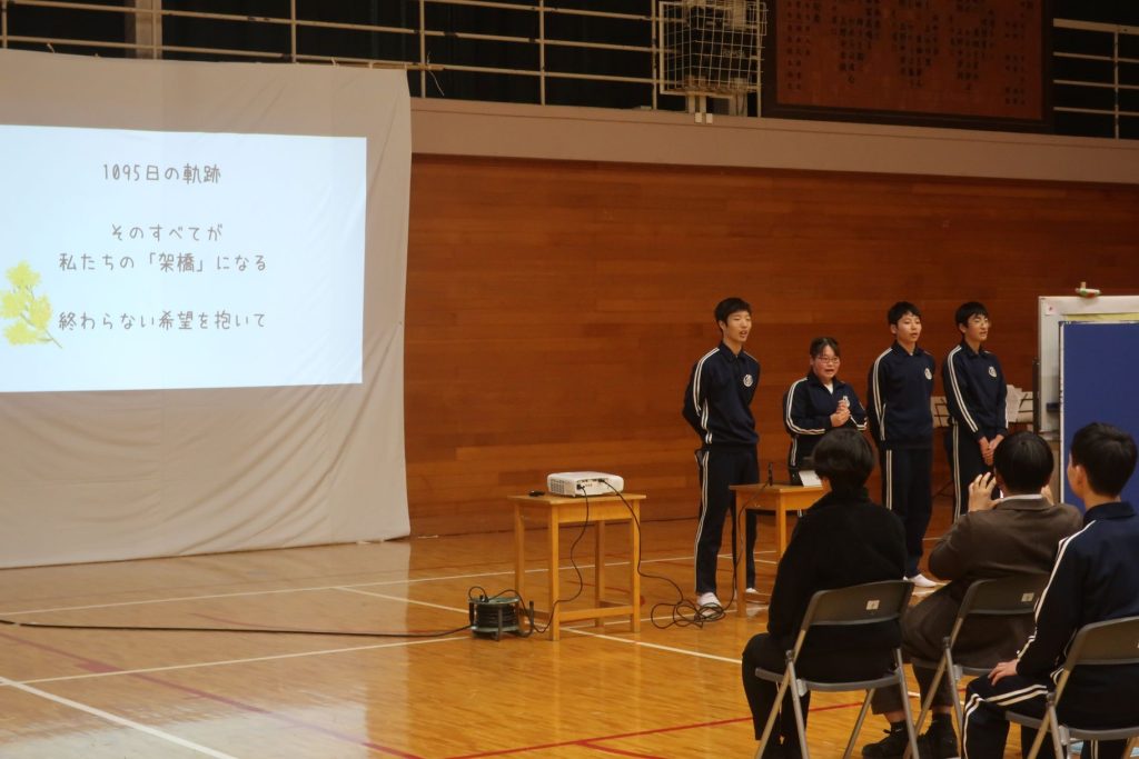 3年生の卒業が迫ってきました。3年生への感謝の気持ちを伝えるために毎年行っているのが予餞会です。1年生も2年生もかなり準備に時間をかけて来ました。自分たちで話し合って3年生を喜ばせる企画を考え、準備練習をし、本番を迎えたわけです。3年生にとって気持ちの伝わる素晴らしい行事となりました。そして、1,2年生にとっても素晴らしい経験の場となりました。こうやって心はつながっていくのだと改めて感じた予餞会でした。 アクセス数: 5