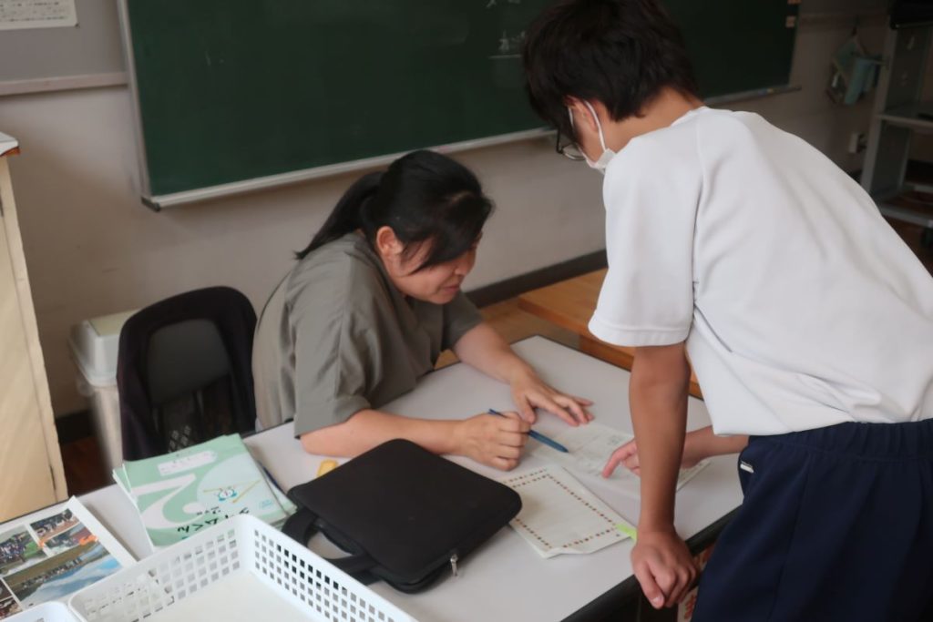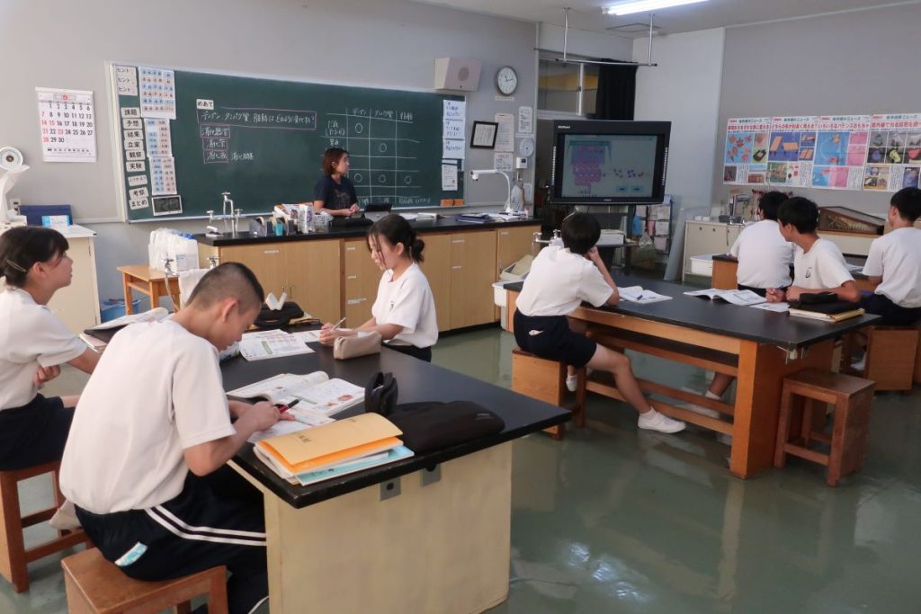 1年生の数学では、文章題を方程式に表す学習をしました。問題演習では、先生に聞いたり、確認したり、友だちと相談したりする姿が見られました。授業中のにコミュニケーションがとても大切です。