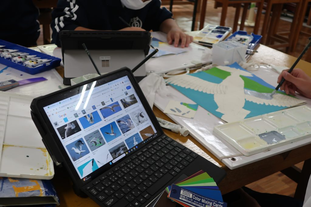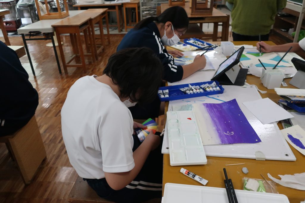1年生の美術では、1~12月のどこかの月をイメージして水彩画にしています。色合いを工夫しながら、筆をすすめていました。完成した作品は、青樹祭で展示します。